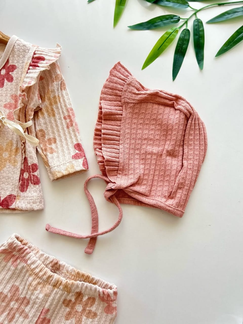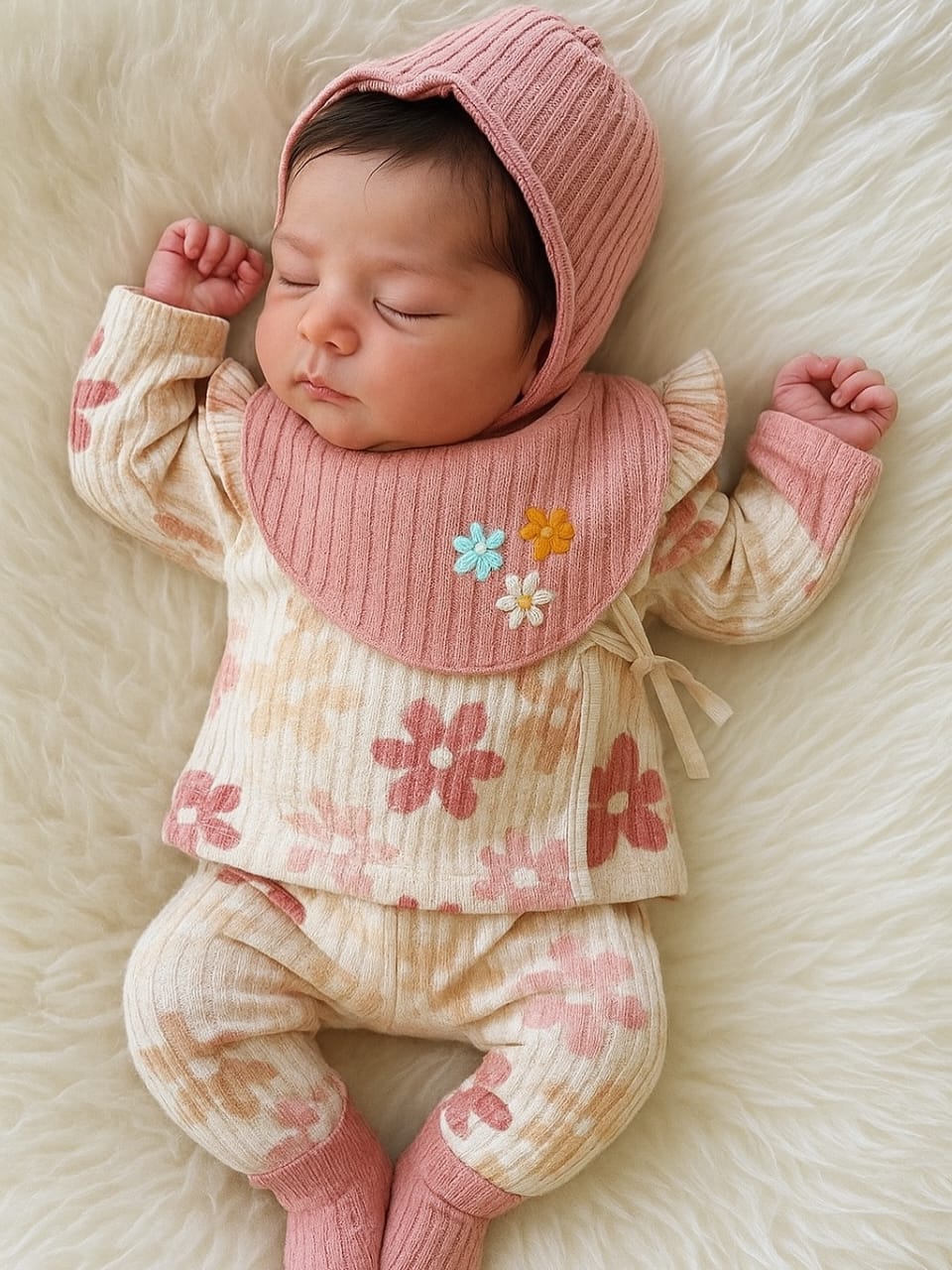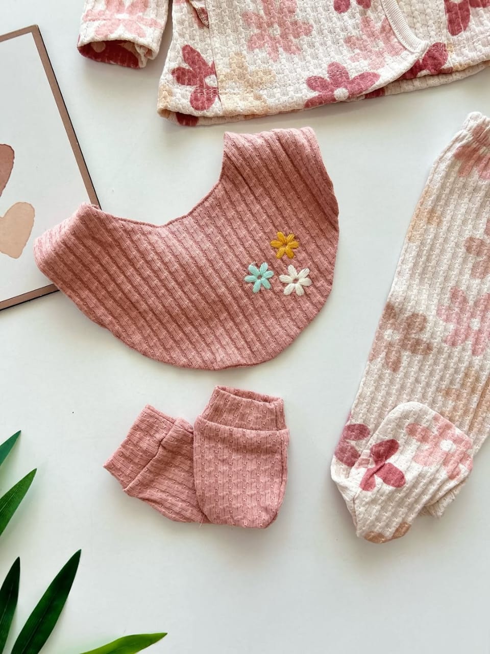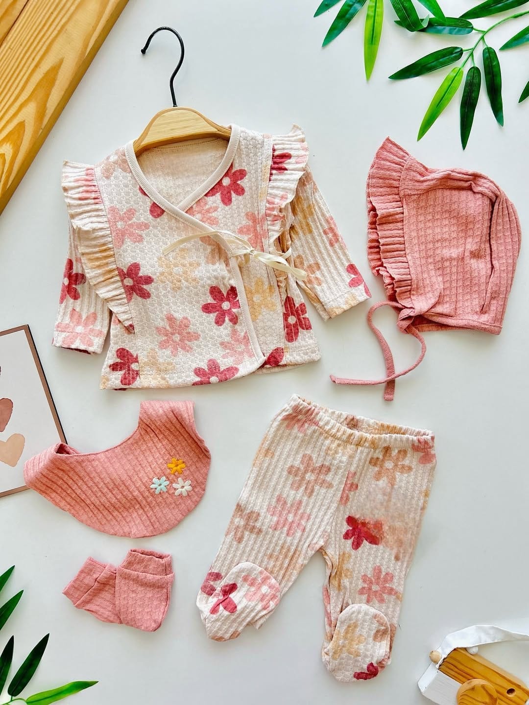 Un ensemble fleuri en coton léger comprenant une veste cache-cœur, un pantalon à pieds, un bonnet, un bavoir et des chaussettes assorties. Parfait pour donner un look doux et élégant à bébé.